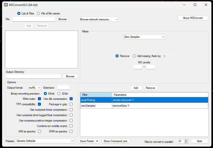 --mzML --64 --zlib `