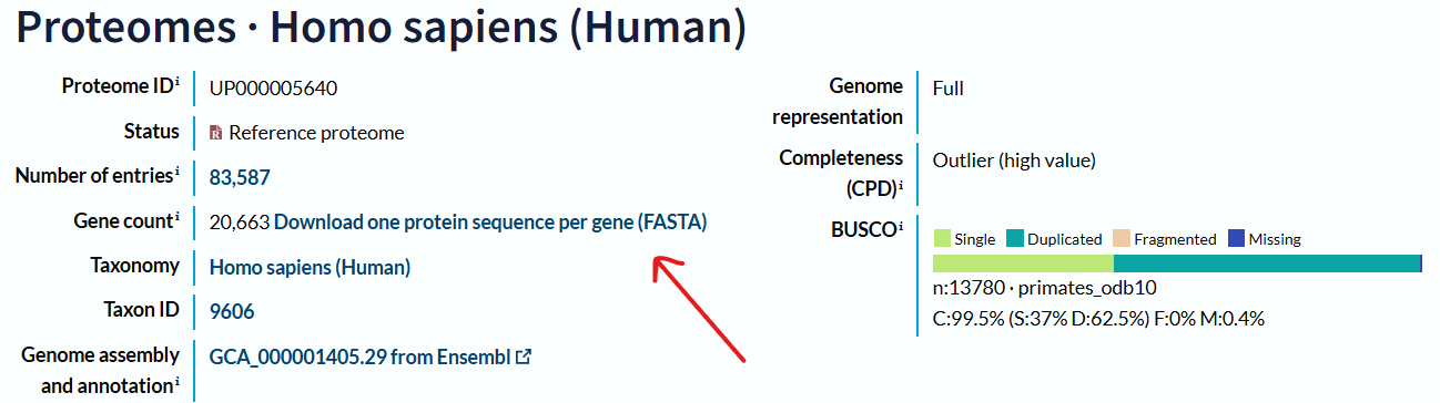 💡Tip: For mass spectrometry folks, if you want to search your spectral data with your favorite software, you will surely need the FASTA database. Fortunately, we don’t have to manually search for all proteins within that species ourselves. There’s a panel that we can use to download the complete proteome for your chosen organism. For example, I want to search for the human proteome FASTA sequence.
